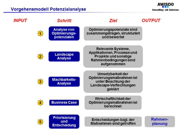 Im dritten Schritt wird nun die Umsetzbarkeit ausgewählter Optimierungspotenziale (Reihenfolge gemäß zuvor vergebener Priorität) vor dem Hintergrund der Gesamt-Landscape geprüft. Dabei ist es hilfreich, zumindest eine Grobkonzeption der Realisierung zu skizzieren und die relevanten Rahmenbedingungen zu strukturieren.