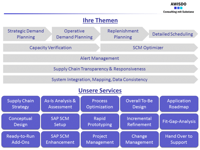 Unser Leistungsspektrum umfasst alle Aktivitäten, die zur Optimierung ihrer Supply Chain erforderlich sind. Somit erhalten Sie eine umfassende Beratungsleistung aus einer Hand:
